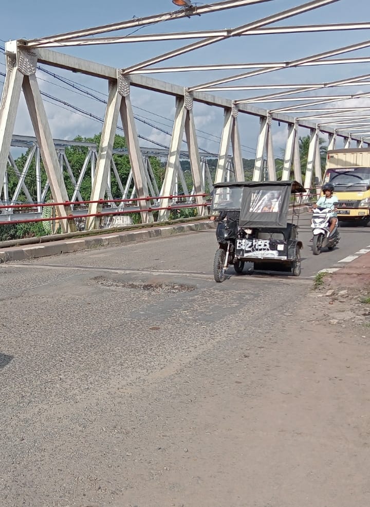 Foto : Sumantri / Lapos Tampak lobang yang cukup besar menganga tepat didepan jembatan musi 1, jalan lintas sumatera Tebing Tinggi, Kabupaten Empat Lawang.--