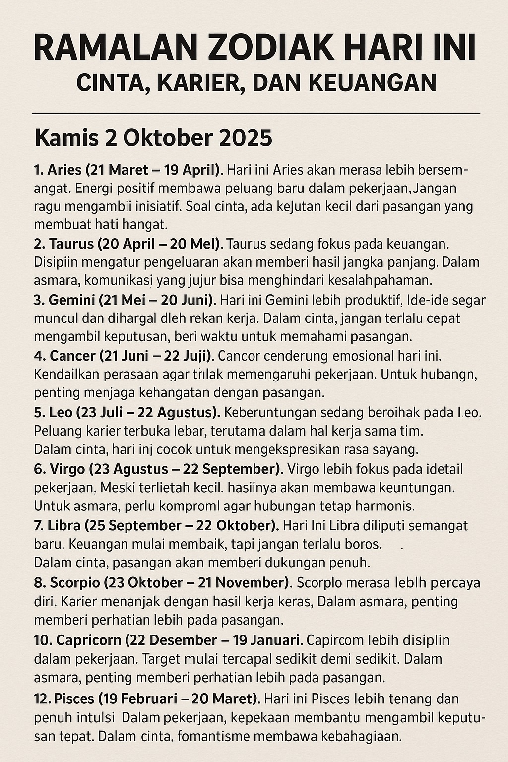 Koranlapos.com – Ramalan zodiak hari ini, Kamis 2 Oktober 2025, bisa menjadi panduan ringan untuk menjalani aktivitas. Bagi sebagian orang, membaca ramalan bintang memberi semangat sekaligus motivasi menghadapi rutinitas. Berikut ulasan lengkap ramalan zodiak harian mulai dari Aries hingga Pisces.