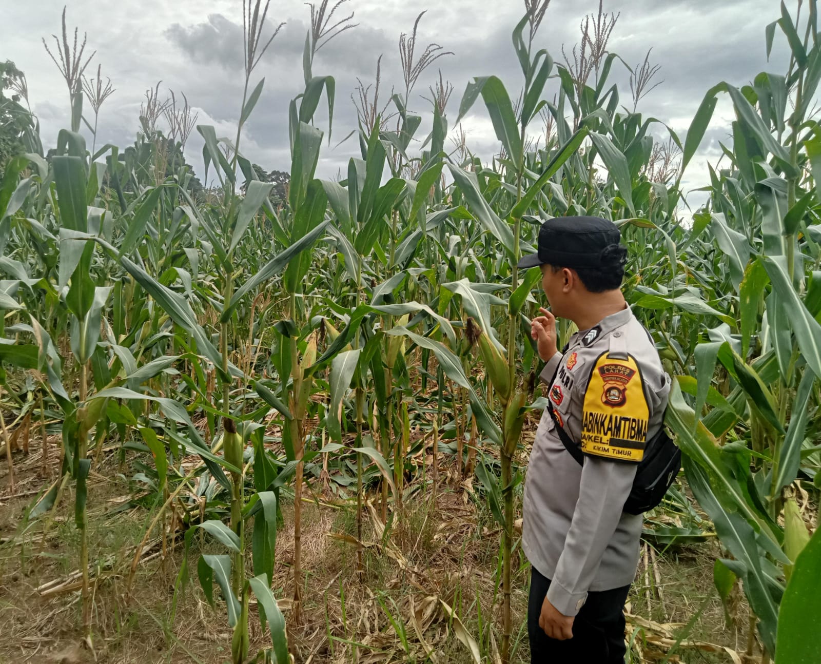 Selain melakukan pengecekan fisik terhadap tanaman jagung, Bhabinkamtibmas juga memberikan imbauan kepada petani agar menjaga keamanan di sekitar lahan pertanian.