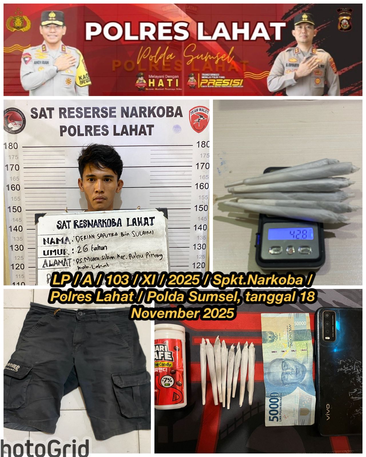 Lahat Pos, Lahat - Jajaran Satres Narkoba di bawah Pimpinan Kasat Res Narkoba Polres Lahat IPTU L.A.E. Tambunan, S.H., M.H., Kanit IDIK I Sat Res Narkoba IPDA Noprianto, S.H., dan Kanit IDIK II Sat Res Narkoba IPDA Raden Putro S.H., beserta anggota telah berhasil ungkap kasus narkoba. Berdasarkan Laporan Polisi LP / A – 103 / XI / 2025 / Spkt.Narkoba / Polres Lahat / Polda Sumsel, tanggal 18 November 2025.
