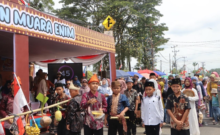 Peserta karnaval yang berasal dari tingkat SD, SMP, hingga SMA dari sejumlah kecamatan menampilkan beragam tradisi khas Muara Enim.