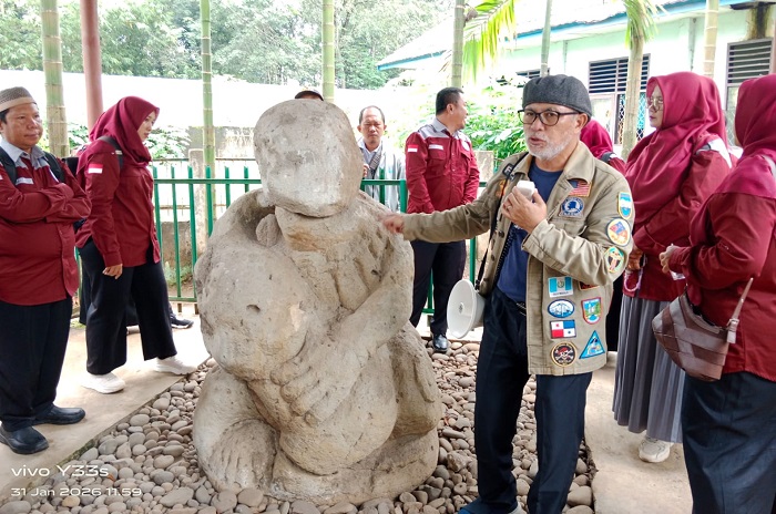 Mario Andramartik menjelaskan Situs Megalitik Batu Puteri kepada Komunitas Belajar Mata Pelajaran IPS Jenjang SMP Kabupaten Lahat.--